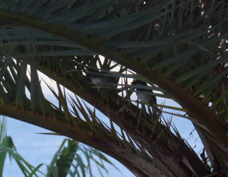 Aujourd'hui, je me suis levé de bonne heure pour tenter d'observer nos voisins en douce. Notre terrasse est en effet tout juste à la hauteur d'un palmier qui offre le gîte à des couples de tourterelles, de pouillots et de moineaux des Canaries. En pleine prépa pour mon futur examen d'oiseaulogie.